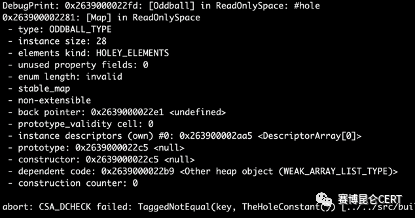 利用该漏洞可以泄露一个theHole value到JS的执行环境, 利用该值, 可以触发以前公开利用中引入的一个csa_dcheck failed:![]()