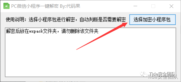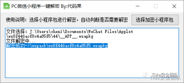 了解了加密后或许你这时候一定有了什么想法,没错你想的肯定是手撕代码写一个解密脚本,对于微信包解密的脚本网上有很多相关的分享这里我不在摘抄了,有兴趣的小伙伴们可以自行去百度。这里我们使用 @daimaguo 师傅使用C#开发的PC微信小程序包解密工具。