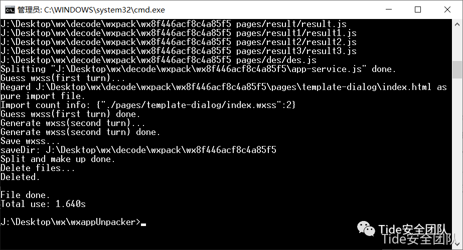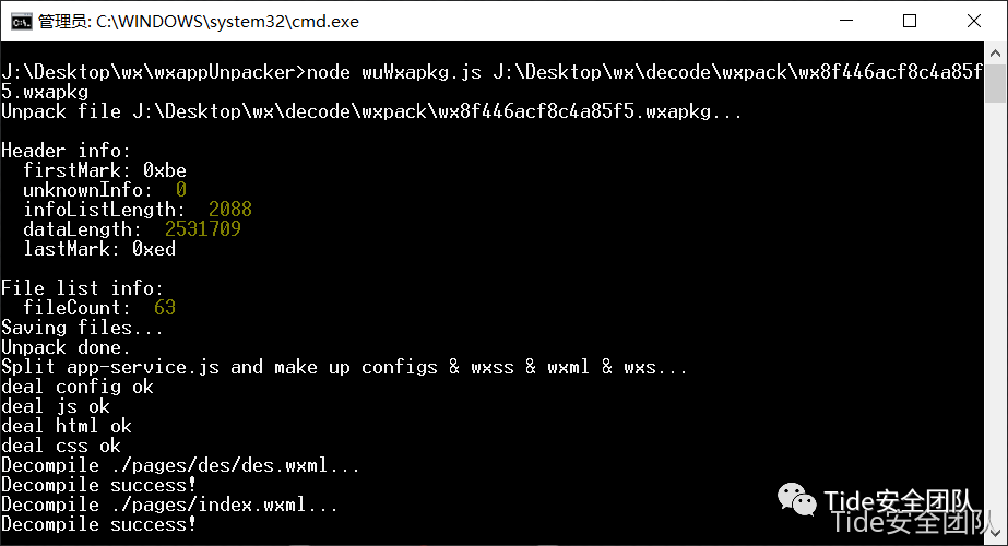 node wuWxapkg.js J:\Desktop\wx\decode\wx8f446acf8c4a85f5.wxapkg## “J:\Desktop\decode\wx8f446acf8c4a85f5.wxapkg”为解密后的小程序包路径位置
