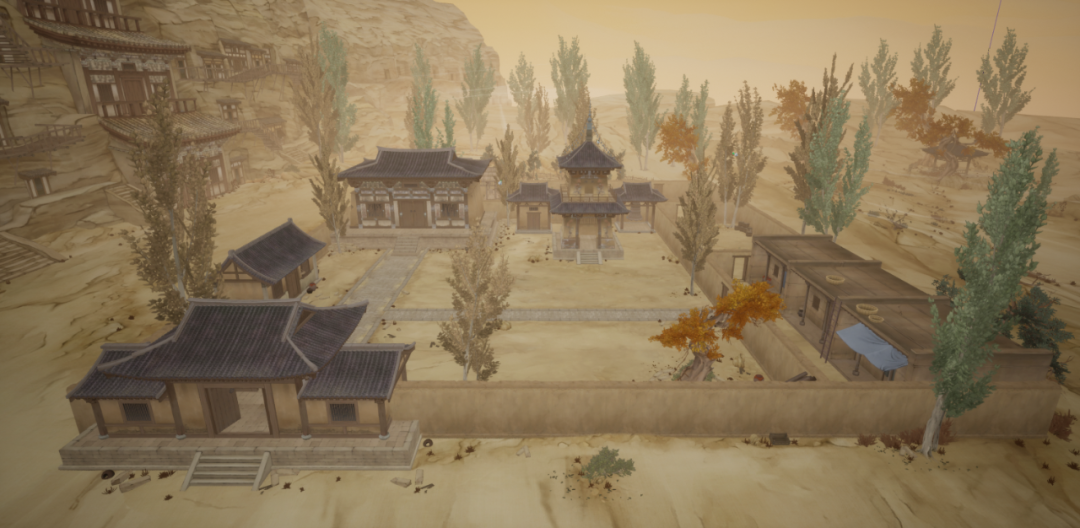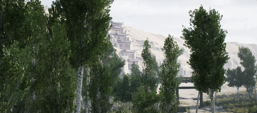 遍布莫高窟、三界寺周围的植被,则参考了敦煌地区独特的胡杨、新疆杨、芨芨草、猫头草等。