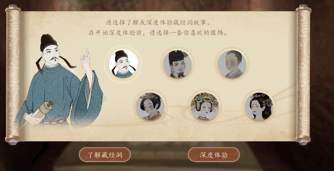 作为“数字藏经洞守护人”的你,可以从6个主角造型中任选其一,穿越到晚唐、北宋、清末等不同的历史朝代,与人物NPC(非玩家角色)对话互动,沉浸式感受莫高窟从洞窟开凿、封藏万卷,到重现于世、文物流散、再次聚首的千年历史变迁。