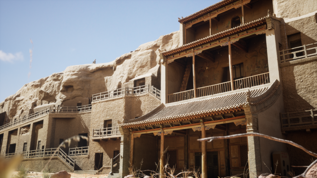 在数字照扫和三维建模阶段,腾讯游戏CROS团队就渲染了超过3万张海量素材,生成超9亿面的超拟真数字模型,首次在数字世界还原了1600m莫高窟外崖面原貌,并且以毫米级1:1高精度复刻了莫高窟“三层楼”和第16、17窟(藏经洞),让窟内壁画、塑像和文物细节无限接近真实场景效果,打造出身临其境的超拟真体验。
