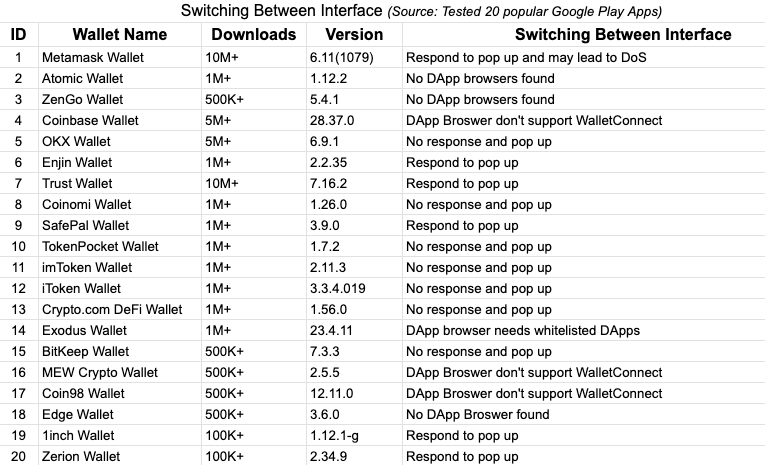 4. 部分钱包 App 如 Exodus Wallet 和 Edge Wallet 在连接测试环境下未找到相关的 DApp 进行测试,无法判断其切换界面后的响应情况。