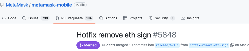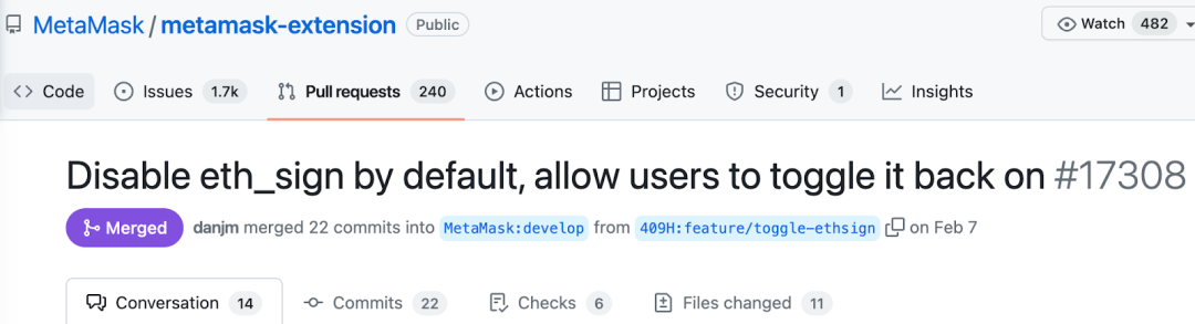 不过如果只是禁用了 eth_sign 也不是完全没有风险(本文仅是拿 eth_sign 举例说明),我们还是呼吁更多的钱包开始禁用它。以用户数量最多的 MetaMask 钱包为例,其插件端已经在 2023 年 2 月 10 号发布的 V10.25.0 版本默认禁用 eth_sign,而移动端也在 2023 年 3 月 1 号发布的版本号为 6.11 开始默认不支持 eth_sign,用户需要到设置里手动打开才能使用它。