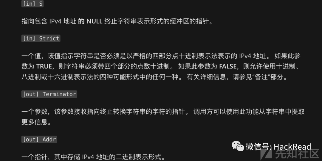 RtlIpv4StringToAddressA:RtlIpv4StringToAddress函数将IPv4地址的字符串表示形式转换为二进制IPv4地址。