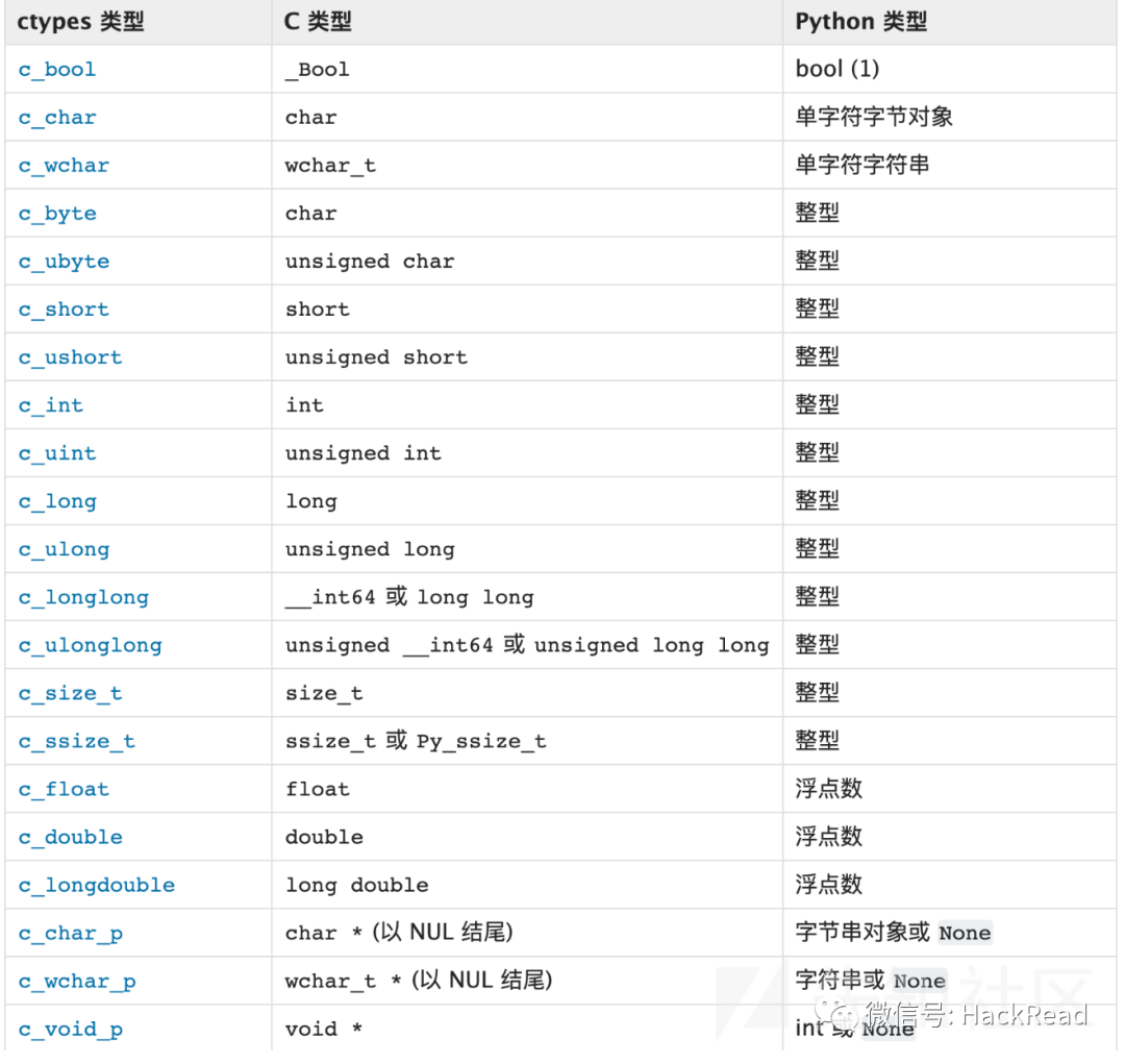 这里补充一下ctypes库中ctypes类型对应的C类型和Python类型。