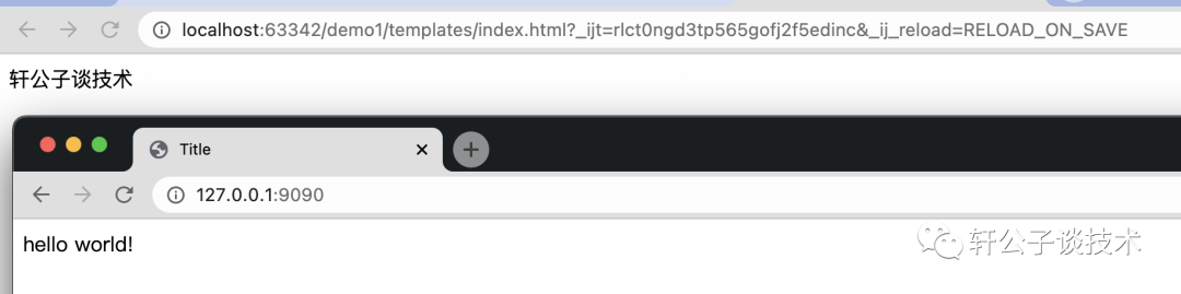 <!DOCTYPE html><html xmlns:th="http://www.thymeleaf.org"><head><meta charset="UTF-8"><title>Title</title></head><body><!--th:text 为 Thymeleaf 属性,用于在展示文本--><h1 th:text="hello world">欢迎关注轩公子谈技术</h1></body></html>