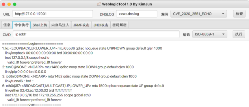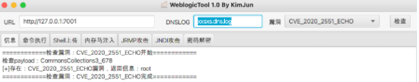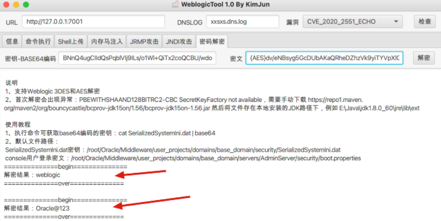 WeblogicTool,GUI漏洞工具,支持漏洞检测、命命令执行、内存马注册、密码破解等,支持最近的CVE-2023-21839漏洞T3&&IIOP,JNDI和JRMP类型漏洞需要填写自定义的dnslog地址,防止waf拦截常用的dnslog域名。