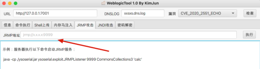 jrmp类型的漏洞只能使用jrmp模块进行攻击,在vps上使用yso启动jrmp,工具中填入vps的jrmp地址即可