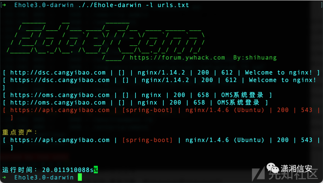 下一步便是将收集到到域名全部进行一遍指纹探测,从中找出一些明显使用CMS、OA系统、shiro、Fastjson等的站点。
