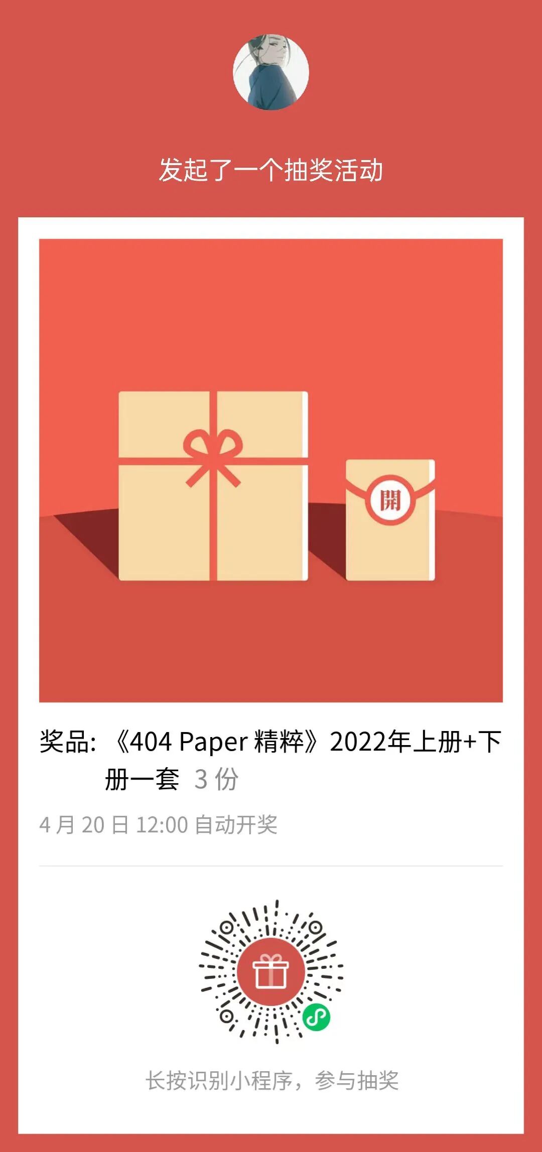 本期福利:转发本文至盆友圈(分组无效),点击下方参与抽奖。抽3位幸运读者送上《404 Paper 精粹》2022年上册+下册一套