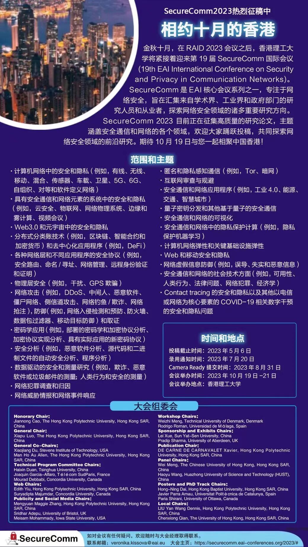 SecureComm is a conference in EAI core conference portfolio focusing on cybersecurity. The aim of SecureComm is to bring together researchers and practitioners in academic, industry, and government in security, networking, communication and other related communities to explore important research directions in the field. The 19th SecureComm conference seeks submissions of high-quality research contributions. Topics of interest encompass ALL areas of secure communications and networking. Topics in less related areas will be considered if a clear connection to secure communication and networking is demonstrated. Topics addressing interdisciplinary challenges in different application domains are welcome.