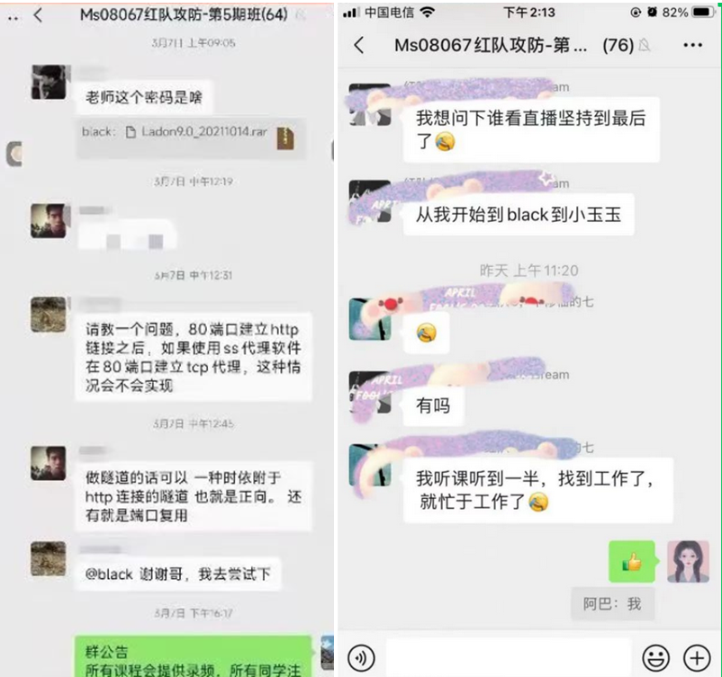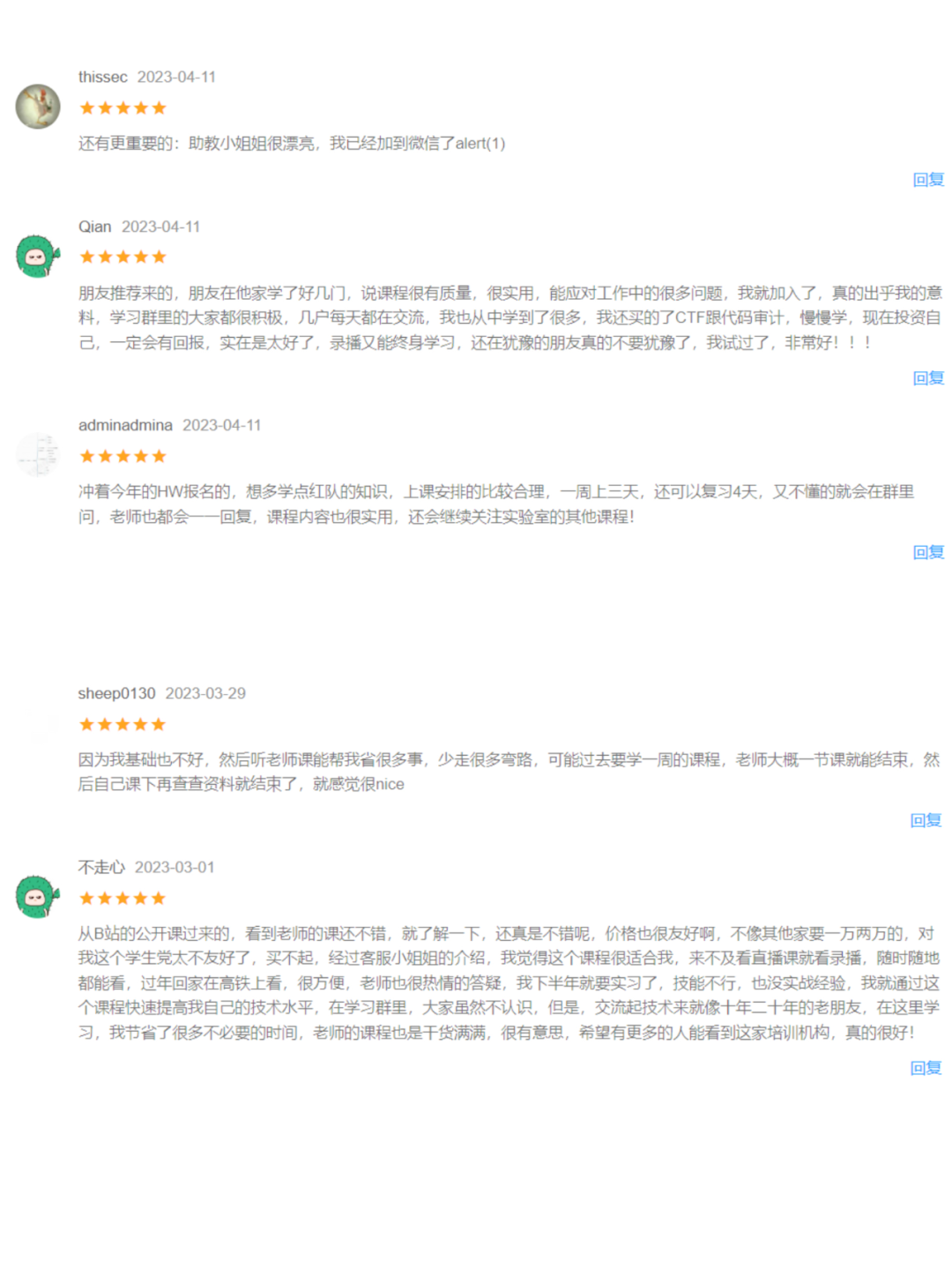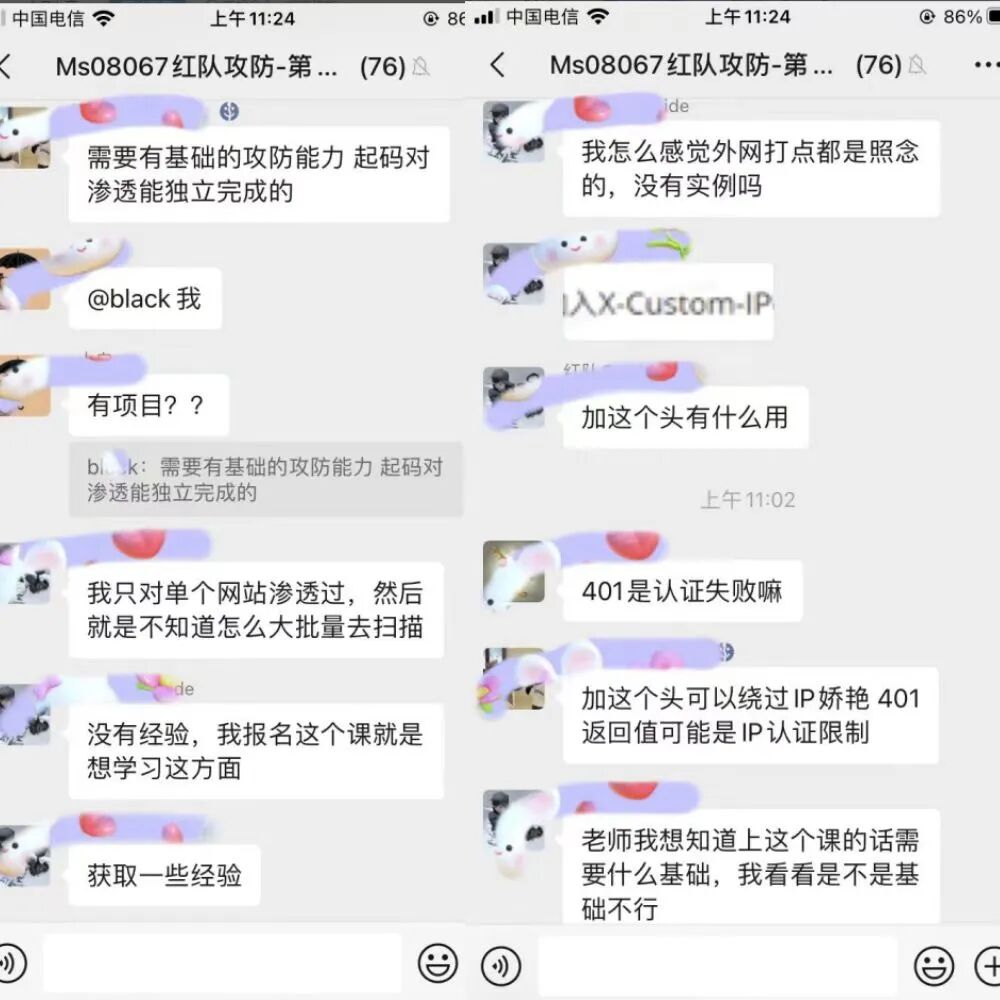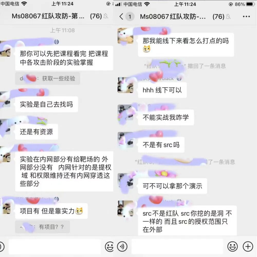 A:印象的话,每个老师的教学风格不同,不过也都有共性,倾向于教思路,而且老师人很好,好几次不是课程里的问题,老师也都帮忙解答,这对我来说,很重要,有的时候工具你也会,原理你也会,但是就是缺少发现问题的思考,每个老师遇到问题的思考都会不同,但是总能解决问题,由此可见渗透测试中思路是非常重要的。红队的三个老师都很不错,课程虽然结束了,但是学习群里的问题,只要@老师们,老师都会出来解答,很赞!