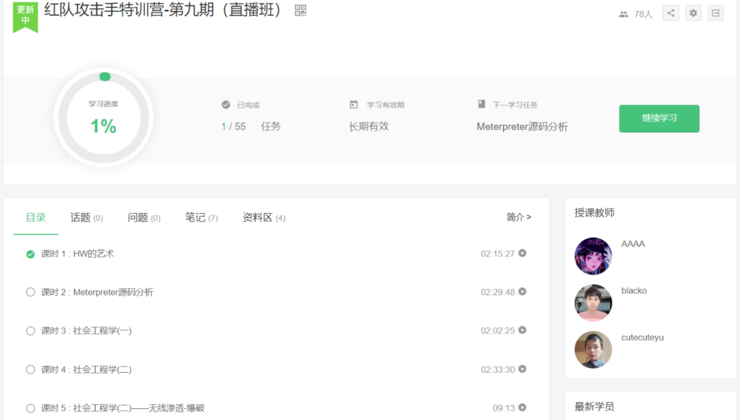 学员们报班成功后首先会开通上一期的录播视频,让学员报完名立刻就可以开始学习,然后再开通实验室内部WIKI和安全Tools权限,让学员先大致了解课程如何学习、学习的思路,预习每一节课程的讲义,以及安全知识的拓展和课外阅读。
