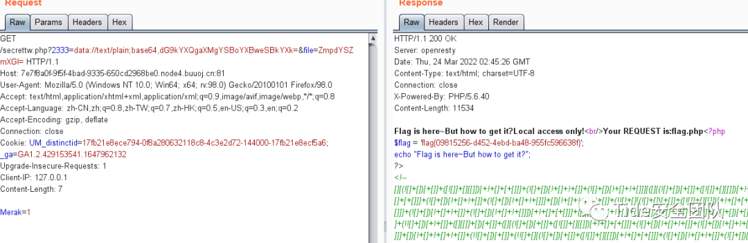 Flag is here~But how to get it? <?phperror_reporting(0);include 'takeip.php';ini_set('open_basedir','.');include 'flag.php';if(isset($_POST['Merak'])){highlight_file(__FILE__);die();}function change($v){$v = base64_decode($v);$re = '';for($i=0;$i<strlen($v);$i++){$re .= chr ( ord ($v[$i]) + $i*2 );}return $re;}echo 'Local access only!'."<br/>";$ip = getIp();if($ip!='127.0.0.1')echo "Sorry,you don't have permission! Your ip is :".$ip;if($ip === '127.0.0.1' && file_get_contents($_GET['2333']) === 'todat is a happy day' ){echo "Your REQUEST is:".change($_GET['file']);echo file_get_contents(change($_GET['file'])); }?>