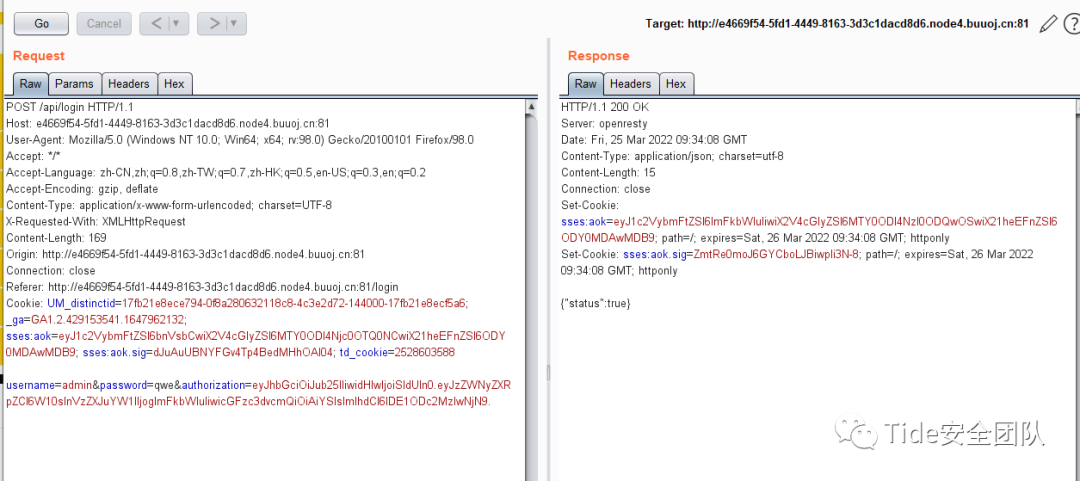 authorization=eyJhbGciOiJub25lIiwidHlwIjoiSldUIn0.eyJzZWNyZXRpZCI6W10sInVzZXJuYW1lIjogImFkbWluIiwicGFzc3dvcmQiOiAiYSIsImlhdCI6IDE1ODc2MzIwNjN9.然后再登录,抓包把JWT改成这个