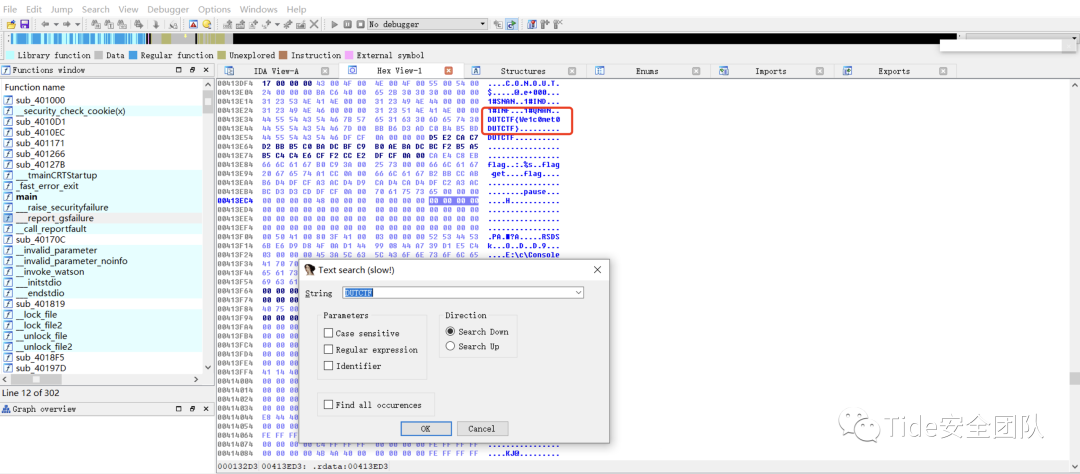 简单运行程序后ida直接搜索关键字“DUTCTF”,找到flag