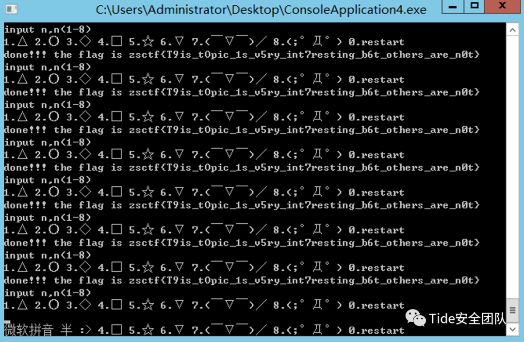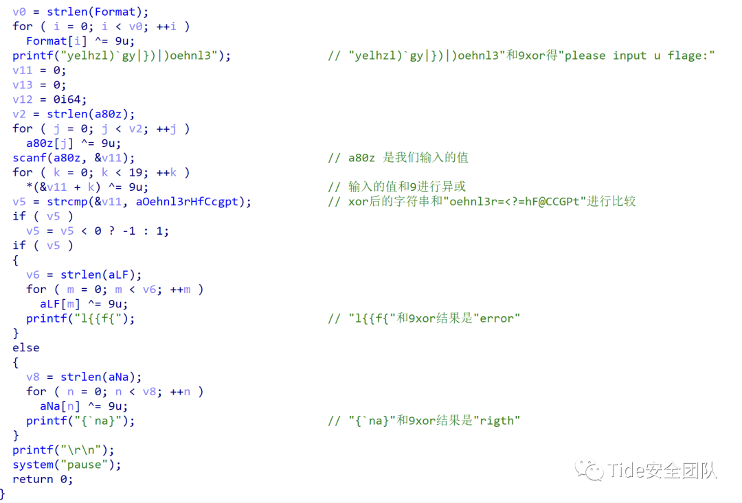 int wmain(){signed int v0; // ecxsigned int i; // eaxsigned int v2; // ecxsigned int j; // eaxint k; // eaxint v5; // eaxsigned int v6; // ecxsigned int m; // eaxsigned int v8; // ecxsigned int n; // eaxchar v11; // [esp+0h] [ebp-18h] BYREF__int128 v12; // [esp+1h] [ebp-17h]__int16 v13; // [esp+11h] [ebp-7h]v0 = strlen(Format);for ( i = 0; i < v0; ++i )Format[i] ^= 9u;printf("yelhzl)`gy|})|)oehnl3");v11 = 0;v13 = 0;v12 = 0i64;v2 = strlen(a80z);for ( j = 0; j < v2; ++j )a80z[j] ^= 9u;scanf(a80z, &v11);for ( k = 0; k < 19; ++k )*(&v11 + k) ^= 9u;v5 = strcmp(&v11, aOehnl3rHfCcgpt);if ( v5 )v5 = v5 < 0 ? -1 : 1;if ( v5 ){v6 = strlen(aLF);for ( m = 0; m < v6; ++m )aLF[m] ^= 9u;printf("l{{f{");}else{v8 = strlen(aNa);for ( n = 0; n < v8; ++n )aNa[n] ^= 9u;printf("{`na}");}printf("\r\n");system("pause");return 0;}