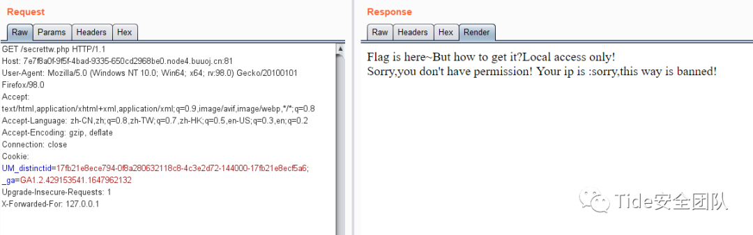 提示对不起,希望来自某个人?既然提到了Forwarded-For,那基本只能是x-forwarded-for: 127.0.0.1