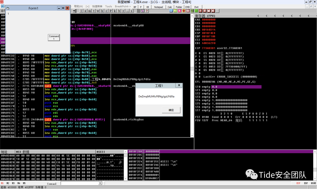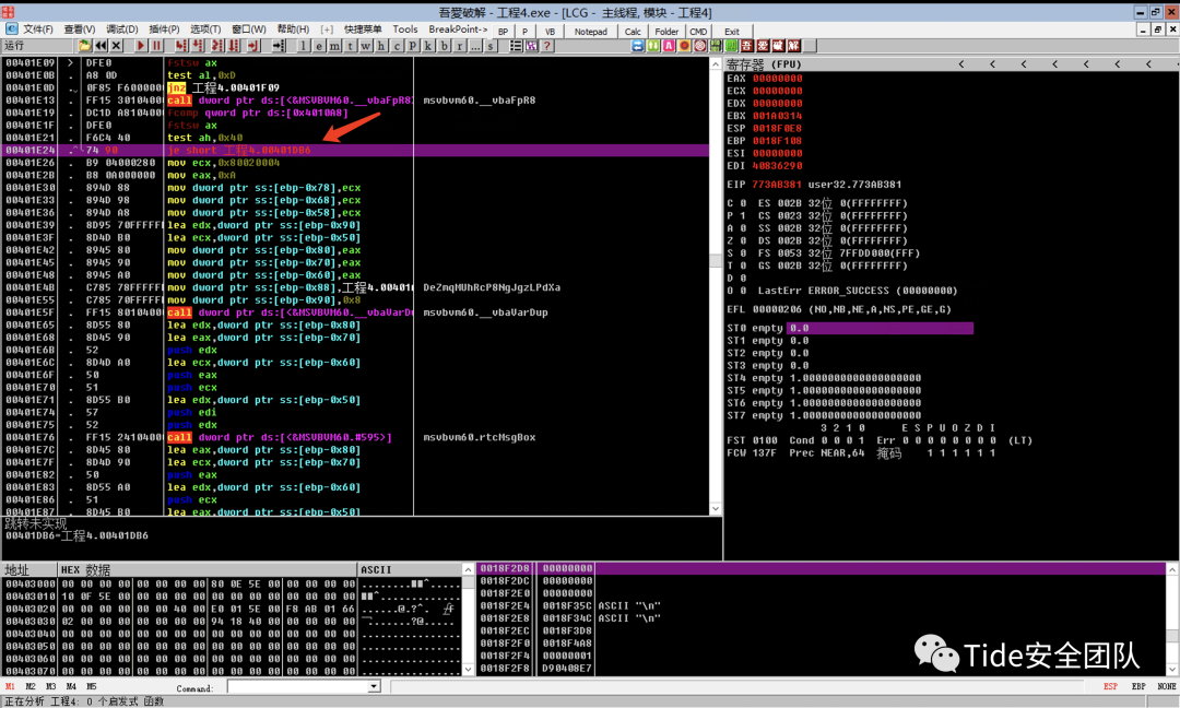 这道题目用OD也可以,直接搜索中文字符串,找到关键点下断点,然后一步步调试,在0x401E24处发现一个跳转,用NOP填充,然后运行也可以。