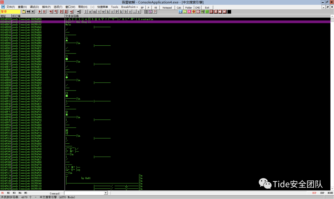 首先打开看一下,是个小游戏,应该是通关了就给flag,既然这样那用OD打开,首先中文搜索查找关键字。