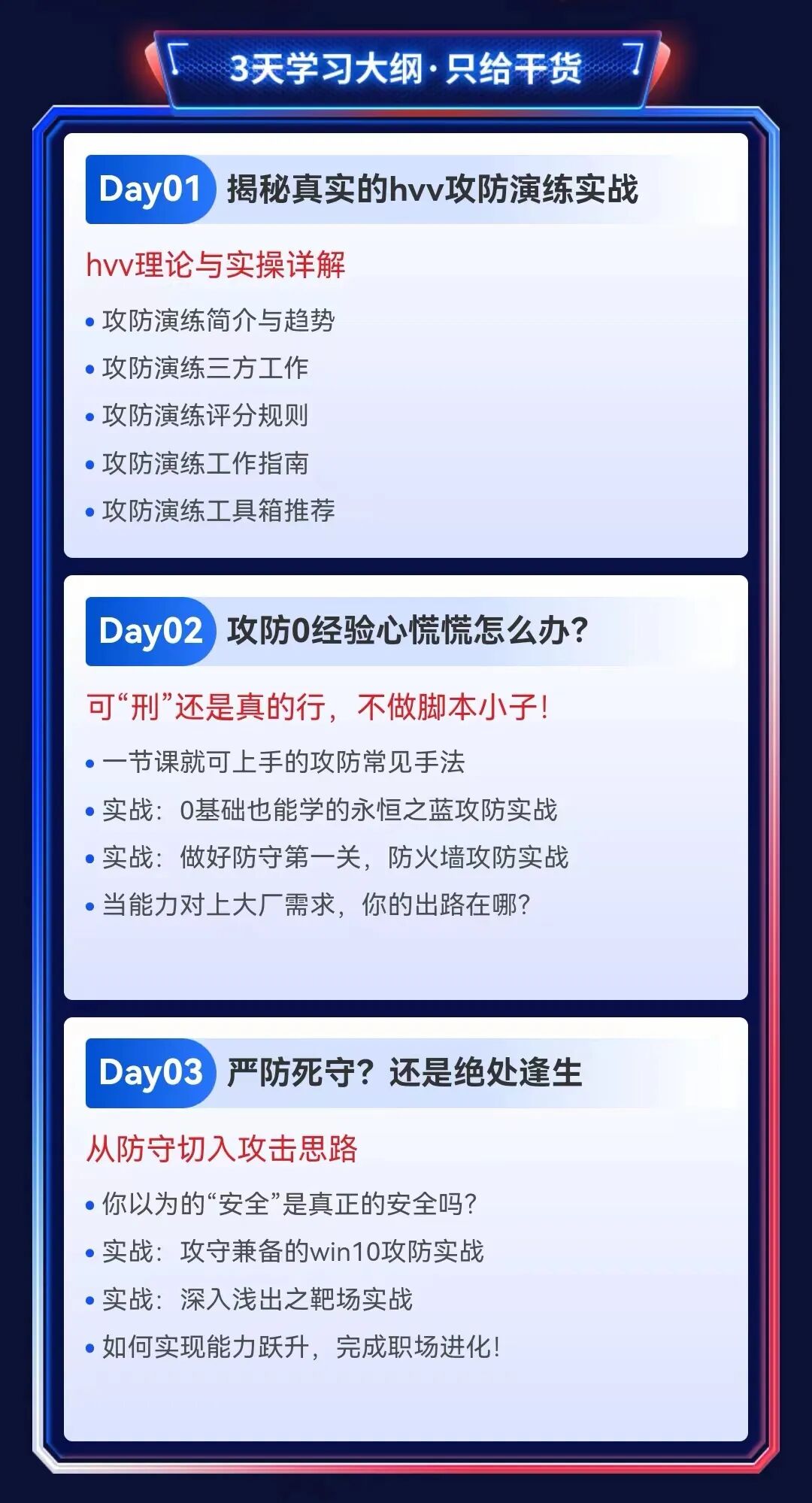 ·【第一天】:深入剖析真实的HV攻防演练实战,从理论到实操进行详解。我们将探讨攻防演练的基本概念、趋势和评分规则,以及三方工作和工作指南