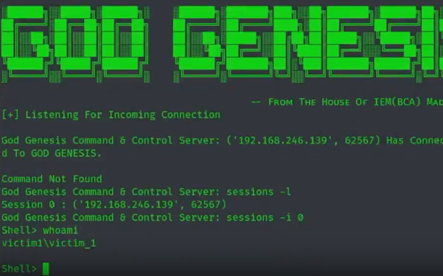 God Genesis 是一个完全用 Python3 编码的 C2 服务器,旨在帮助红队和渗透测试人员。目前它只支持 TCP 反向 shell 但等一下,它是一个 FUD,可以从任何目标 WINDOWS 机器给你管理 shell。