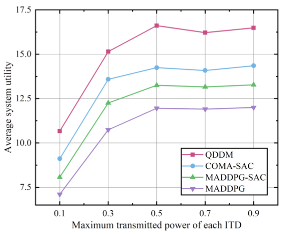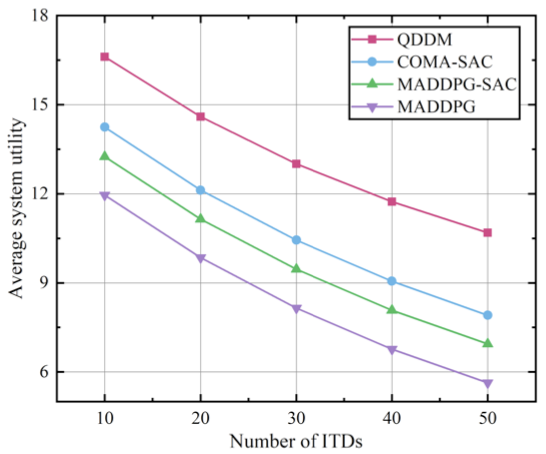 图6显示了四种方法在不同ITDs数量下的平均系统效用。从图中可以看出,随着ITDs数量的增加,系统效用显著下降。这是因为ITDs密度越高,工作负荷就越重。此外,QDDM的系统效用始终高于其他方法。