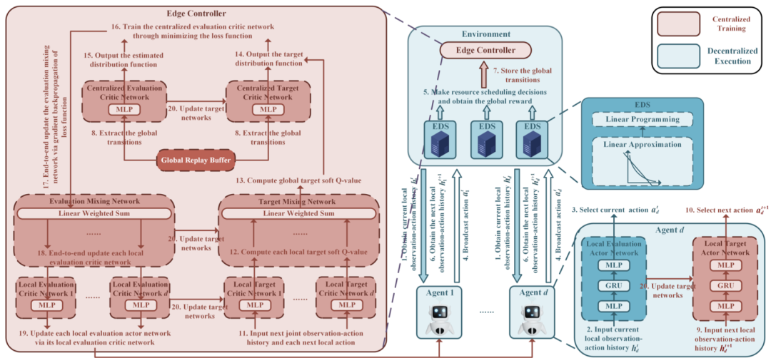 图2显示了QDDM框架图,该框架由集中训练阶段(红色)和分散执行阶段(蓝色)组成。每个智能体包括1)一个局部评价演员网络和2)一个局部目标演员网络。边缘控制器包括1)一个集中评价评论家网络和2)一个集中目标评论家网络,3)一个评价混合网络,4)一个目标混合网络,5)D个局部评价评论家网络,6)D个局部目标评论家网络和7)一个全局重放缓冲区。局部评价演员网络表示每个智能体用于选择动作的估计策略函数。局部目标演员网络表示各智能体的目标策略函数。集中目标评论家网络表示全局软状态-动作收益的估计分布函数,用于指导每个局部评价演员网络的训练。集中目标评论家网络的期望是全局估计软Q值函数。集中目标评论家网络表示全局软状态-动作收益的目标分布函数。评价混合网络可以将全局估计软Q值函数分解为局部评价评论家网络的加权线性和。全局重放缓冲区用于存储每个时隙的全局转换。