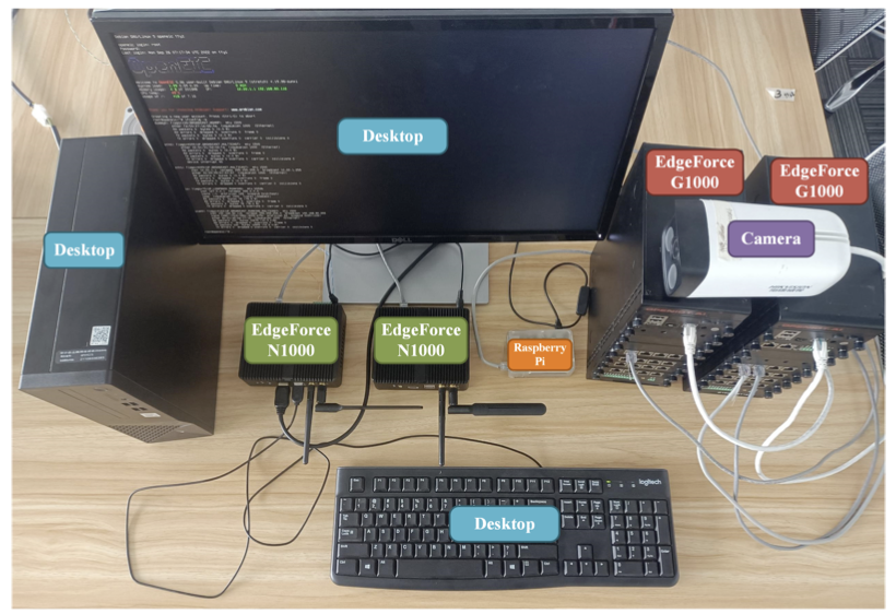 本文建立了一个真实的工业物联网实验平台用于评估所有算法的性能。如图3所示,我们使用桌面作为SDN控制器,桌面配置Intel Core i7-8700 3.20GHz, NVIDIA GTX 1080,和32GB RAM。在这个桌面上还安装了带有Numpy和Pytorch的Python,它可以通过远程连接到CLSs桌面协议(RDP)。CLSs配备了Intel Xeon Cooper Lake 3.4GHz, NVIDIA Tesla V100和64GB RAM,使用EdgeForce G1000作为EDS。每台EdgeForce G1000都通过光纤连接到桌面,其计算能力可以通过扩展卡进行扩展。之后,本文采用EdgeForce N1000和树莓派A/B+/2B作为异构ITD。每个ITD通过IEEE 802.11 b/g/n/ac协议连接到EdgeForce G1000,并配备摄像头收集监控视频数据。考虑到各个ITD的训练速度较慢,所有方法的训练过程都是在桌面进行的。在训练阶段结束后,桌面使用secure shell (SSH)协议将训练好的神经网络(NNs)传输到各个ITD进行性能测试。