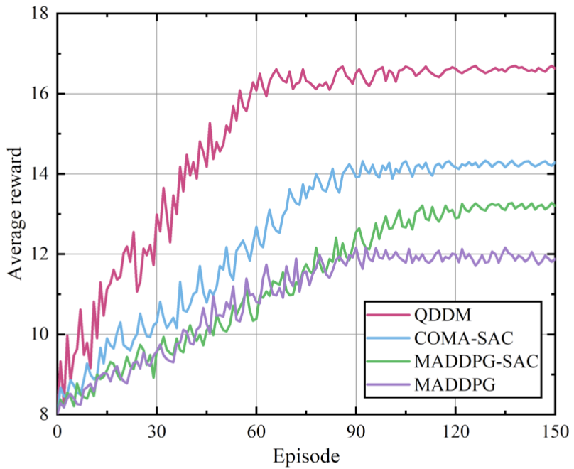 在训练阶段,DNNs通过增加事件数进行多次训练。同时,将平均奖励作为衡量收敛性的指标来降低风险并增加实验结果的可信度。平均奖励被定义为所有episodes的每个时间步骤的平均奖励。图4显示了这四种方法的收敛属性。QDDM、COMASAC、MADDPG-SAC和MADDPG的训练时间分别为132秒、186秒、244秒和182秒。如图所示,QDDM具有最快的收敛速度和最高的平均奖励。原因在于:1)与COMA-SAC、MADDPG- sac和MADDPG相比,QDDM缓解了Q值估计的不精确性。2)与COMA-SAC相比,QDDM采用VFD来解决CDM和MACA问题。3) QDDM利用所提出的线性逼近方法进行最优RS决策。