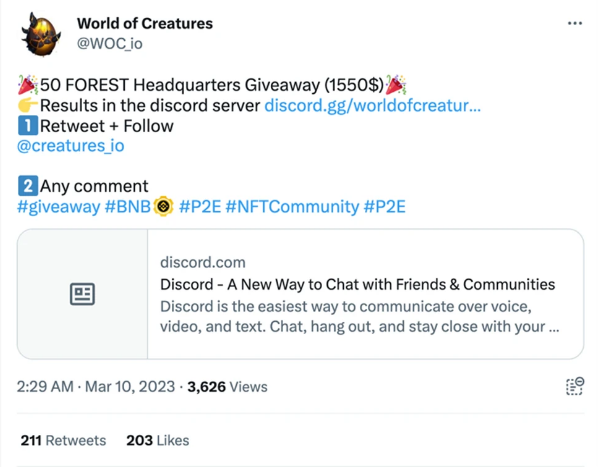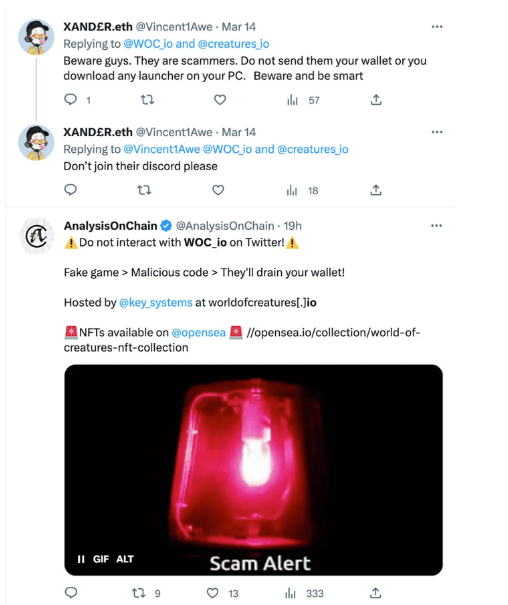 研究人员的传感器在例行检查中检测到了高危示例进行分析,经过仔细检查,发现worldofcretures[.]io网站与示例有关,该网站在Twitter上得到了大肆传播。