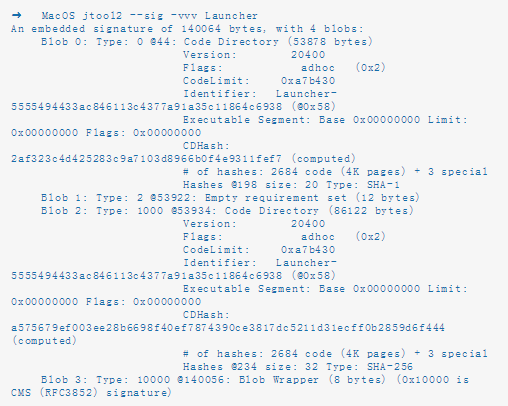 一旦受害者下载了游戏,一个名为LauncherMacOS的.dmg文件,dmg(SHA256:8ea33c34645778b79dd8bb7dcf01a8ad1c79e7ada3fd61aca397ed0a2a57276,被Trend Micro检测为TrojanSpy.MacOS.CypwdStealer.A)在系统中执行。签名如下:
