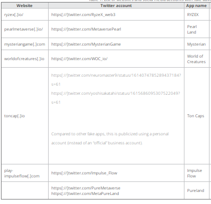检查该网站后台发现假冒应用程序的页面是在2023年1月才创建的,所有的图形和文本都是直接从另一个P2E应用程序的网站上获取的。这款假冒应用程序的推特页面图像也直接取自合法应用程序的社交媒体页面,于2022年10月创建,与2021创建的合法应用程序帐户相比,这是相对较新的。不知情的受害者可能没有听说过这款游戏,他们很容易将假冒页面误认为是合法应用程序的原始游戏和官方社交媒体账号。