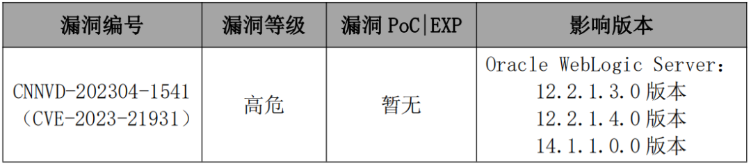 近日,嘉诚安全监测到Oracle官方发布了 WebLogic Server 敏感信息泄露漏洞的安全风险通告,漏洞编号为:CNNVD-202304-1541(CVE-2023-21931)。