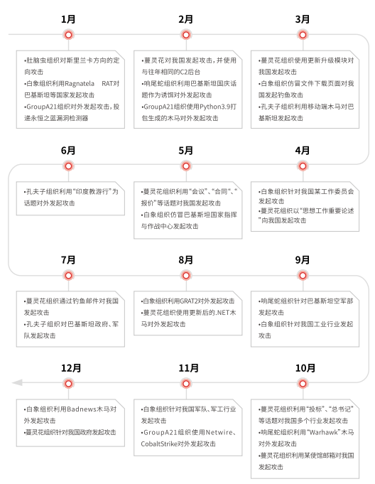 蔓灵花、白象、绿斑.........其他组织:在今年发现的 APT 攻击活动中,除上述较为频繁的组织外,还有一些针对性更强的低频 APT 攻击活动。这些攻击活