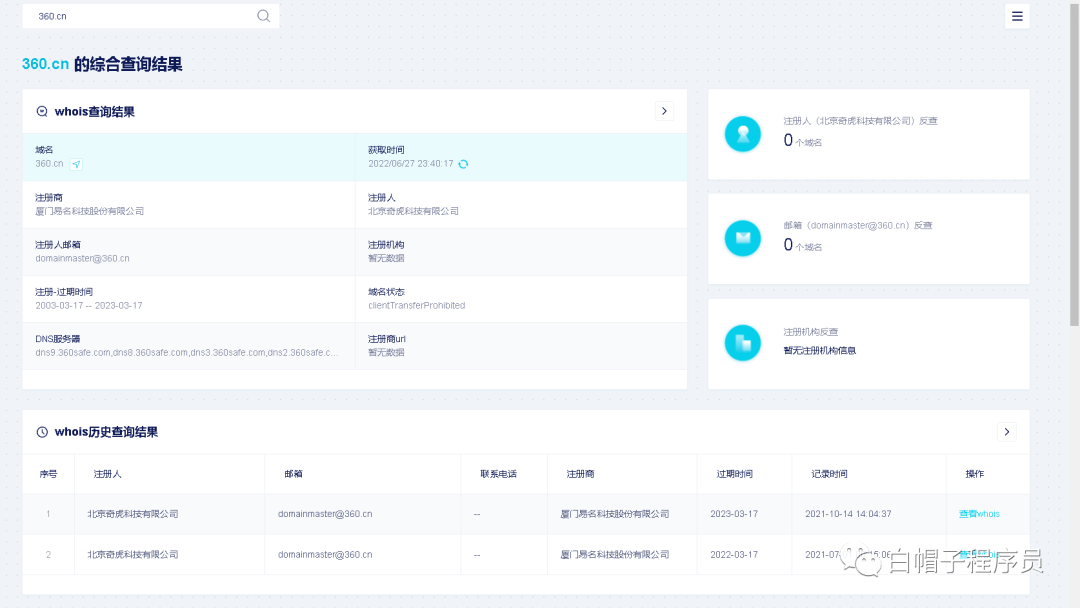 通过whois信息可以获取注册人的关键信息。如注册商、联系人、联系邮箱、联系电话,也可以对注册人、邮箱、电话反查域名,也可以通过搜索引擎进一步挖掘域名所有人的信息。深入可社工、可漏洞挖掘利用。