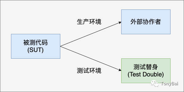 测试替身是在测试阶段用来替代被测系统依赖的真实组件的对象或程序(如下图),以方便测试,这些真实组件或程序即是外部协作者(external collaborators)。这些外部协作者在测试环境下通常很难获取或与之交互。测试替身可以使开发人员或QA专业人员专注于新的代码而不是代码与环境集成。