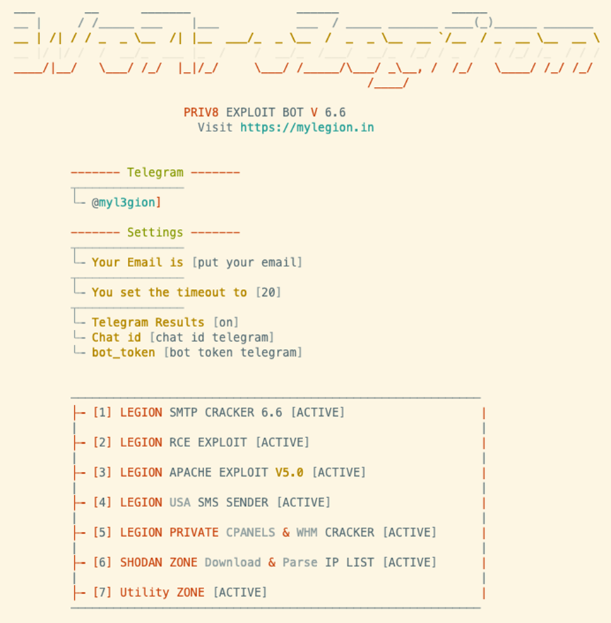 研究人员最近遇到了一种名为 Legion 的新兴基于 Python 的凭证收集器和黑客工具,旨在利用各种服务来滥用电子邮件。该工具通过 Telegram Messenger 出售,包括专用于:枚举易受攻击的 SMTP 服务器,进行远程代码执行(RCE),利用易受攻击的 Apache 版本,暴力破解 cPanel 和 WebHost Manager (WHM) 帐户,与 Shodan 的 API 交互以检索目标列表(前提是您提供 API 密钥)等。