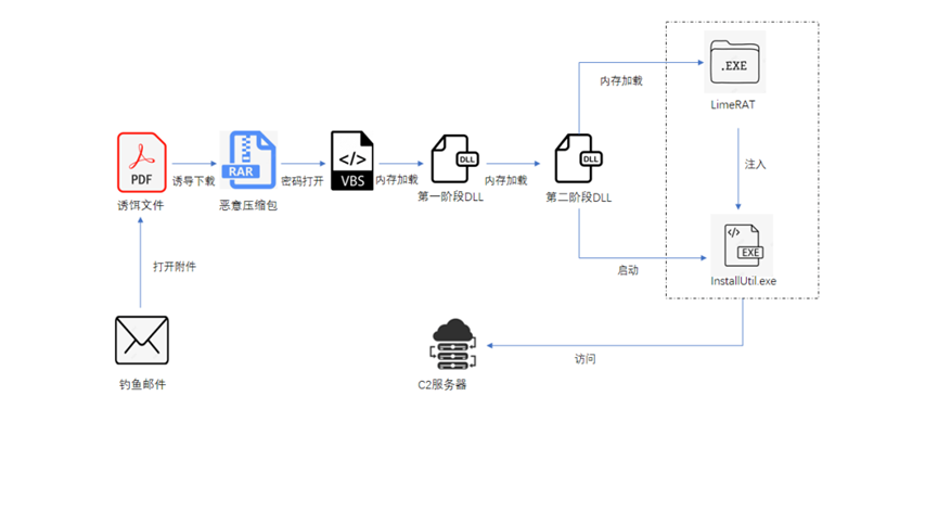 近期,研究人员在日常情报挖掘中发现并捕获到了盲眼鹰针对哥伦比亚地区的攻击行动。该组织一如既往地采用鱼叉攻击,以PDF文件作为入口点,诱导用户点击文档里面的恶意链接下载RAR压缩包文件。该压缩包文件需要输入诱饵文档中的提示密码才能解压,解压后是伪装成PDF文件图标的VBS脚本。该脚本被用户点击执行后将开启一段复杂多阶段的无文件攻击链,最终加载的是LimeRAT远控木马,而没有使用前期的AsyncRAT、NjRAT远控木马,这都表明该组织攻击武器丰富多样化,不同时期会使用不同的攻击木马。