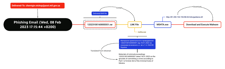 2023 年 2 月 9 日,研究人员发现了针对乌克兰外国情报局 (SZRU) 和乌克兰安全局 (SSU) 等乌克兰政府实体的鱼叉式网络钓鱼活动。分析师确定了一个公开暴露的简单邮件传输协议 (SMTP) 服务器,并高度自信地评估威胁行为者使用 SMTP 服务器制作和发送网络钓鱼电子邮件。