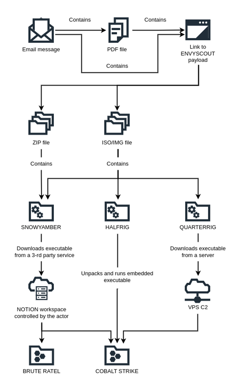 在所有观察到的案例中,攻击者者都使用了鱼叉式网络钓鱼技术。冒充欧洲国家大使馆的电子邮件被发送给外交职位的选定人员。信函中载有参加会议或共同处理文件的邀请。在电文正文或所附的PDF文件中,包括一个据称指向大使日历、会议详情或可下载文件的链接。