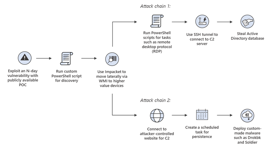新的 Mint Sandstorm 在公开时通常使用概念验证漏洞,因为该公司在发布当天观察到使用 Zoho ManageEngine PoC 的攻击。除了 N-day 漏洞(利用已知漏洞的代码)之外,威胁行为者还使用旧漏洞(例如 Log4Shell)来破坏未打补丁的设备。一旦他们获得网络访问权限,威胁参与者就会启动自定义 PowerShell 脚本来收集有关环境的信息,以确定它是否具有高价值。然后,黑客使用 Impacket 框架在网络上横向传播,同时执行两个攻击链。