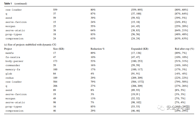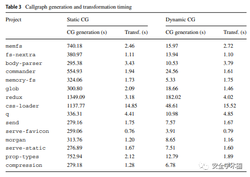 表 3 所示,这里展示了每个项目产生调用图和处理调用图的时间。可以看到的是处理时间大多保持在 3s 左右,比较花时间的在于调用图的构建。而在调用图的构建中,静态图的构建更花时间,并且时间是动态图构建时长的数十倍。因此对于一个项目来说,如果使用 Stubbifier 的话,往往需要增加 5-15 分钟左右的缩减时间,作者认为这个对于一个项目收尾工作来说是可以接受的(这里我认为也是可以接受的时间范围,但这个时间肯定越短越好)。