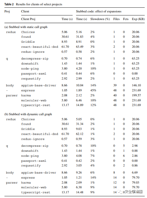 该项研究结果如表 1 所示。可以看到的是,Stubbifier 能够帮助项目缩减大小。静态缩减从 2% 到 87% 不等(平均 56%),动态缩减从 3% 到 89% 不等(平均 31%),并且在 11/15 的项目中,静态有着更好的表现。