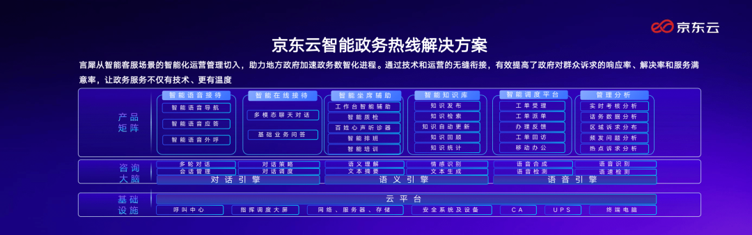 京东云智能政务热线是历经千锤百炼的京东智能服务系统,在政务场景下的落地实践,将智能化应用嵌入到12345“接-派-办-督-考-评”全流程中,形成从接到市民诉求、判断市民问题、自动创造工单并精准派单至相应委办局,跟踪工单执行情况,自动给市民外呼电话反馈办理进度的全闭环。