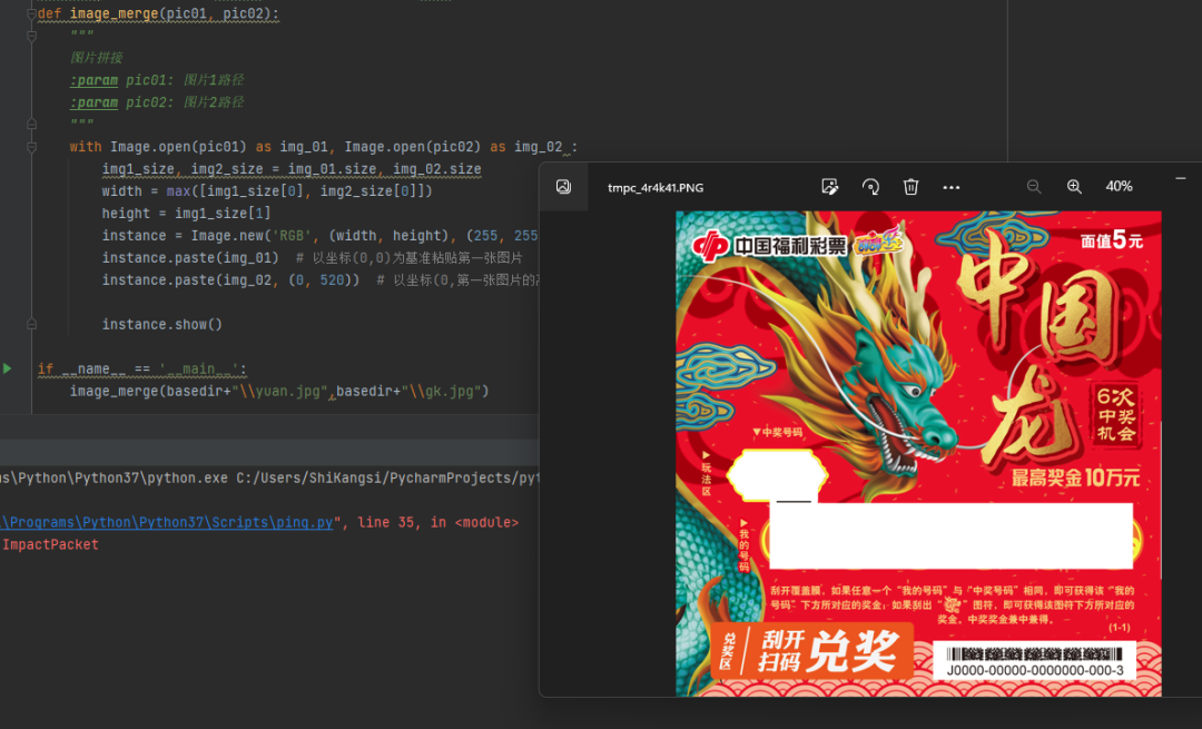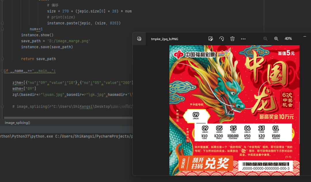 from PIL import Imagebasedir=r"" # 原图和白底图存储路径haomadir=r"" # 号码图片路径jinedir=r"" # 金额图片路径def zgl(yuantu, gk, wodehaoma, zjhaoma):"""图片拼接 原图 白底图 我的号码(这里错了) 中奖号码(和我的号码写反了):param pic01: 图片1路径:param pic02: 图片2路径:return: 保存路径"""with Image.open(yuantu) as img_01, \Image.open(gk) as img_02 ,Image.open(wodehaoma) as img_03:img1_size, img2_size = img_01.size, img_02.sizewidth = max([img1_size[0], img2_size[0]])height = img1_size[1]instance = Image.new('RGB', (width, height), (255, 255, 255)) # 创建背景为白色的空图片instance.paste(img_01) # 以坐标(0,0)为基准粘贴第一张图片instance.paste(img_02, (0, 520)) # 以坐标(0,第一张图片的高)为基准粘贴第二张图片# 拼接我的号码instance.paste(img_03,(215,615))num=0# 切割for i in zjhaoma:print(i)# 拼接中奖号码with Image.open(haomadir+"\\"+str(i["no"])+".png") as zjpic:if num==0:instance.paste(zjpic, (300, 740))else:size=300+(zjpic.size[0]+70)*num# print(size)instance.paste(zjpic,(size,740))# 拼接金额with Image.open(jinedir+"\\"+str(i["value"])+".png") as jepic:if num == 0:instance.paste(jepic,(270,820))else:# 偏移size = 270 + (jepic.size[0] + 28) * num# print(size)instance.paste(jepic, (size, 820))num+=1instance.show()save_path = 'D:/image_marge.png'instance.save(save_path)return save_pathif __name__=="__main__":zjhm=[{"no":"09","value":"10"},{"no":"05","value":"200"},{"no":"15","value":"100000"},{"no":"06","value":"50"},{"no":"13","value":"20"},{"no":"01","value":"5000"}]wdhm=["09"]zgl(basedir+r"\yuan.jpg",basedir+r"\gk.jpg",haomadir+"\\"+str(wdhm[0])+".png",zjhm)