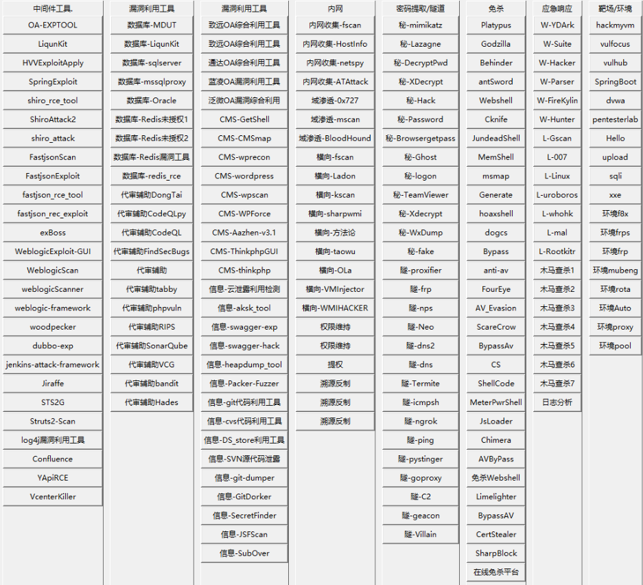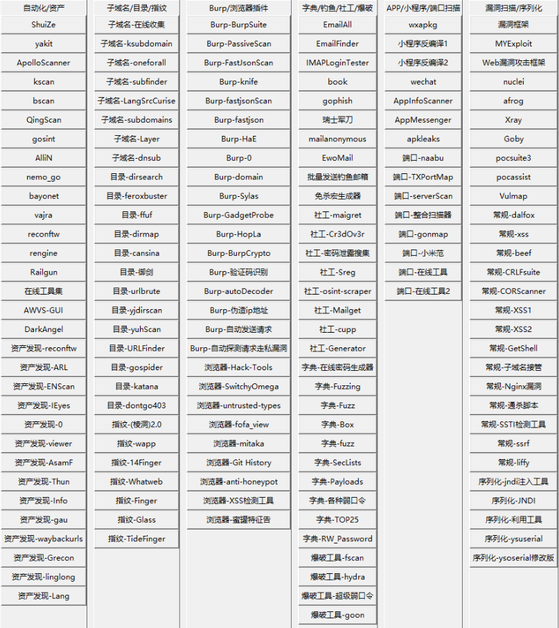 此工具集成资产探测半自动化,WEB渗透,burp及浏览器插件,社工钓鱼,APP小程序渗透,批量漏洞扫描,漏洞利用,内网渗透,隧道代理,免杀,Windows及linux应急响应,训练靶场环境部署等工具指引。